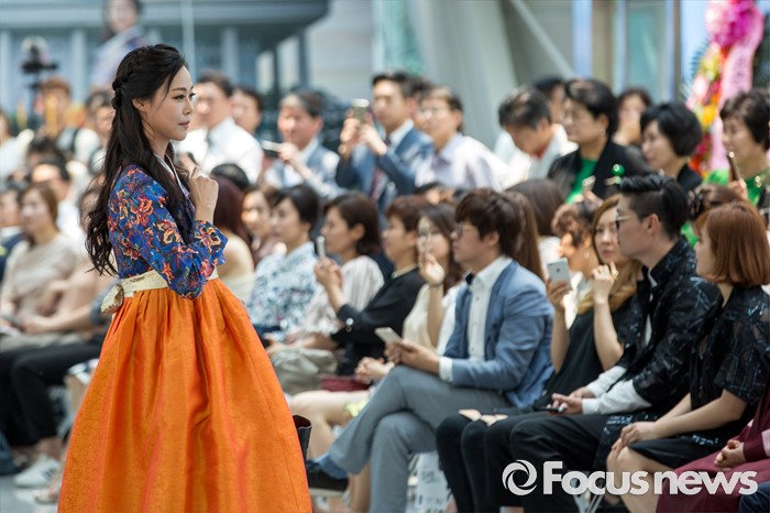 (서울=포커스뉴스) 17일 오후 서울 여의도 국회의원회관에서 열린 '2016 대한민국 국회 초청패션쇼-품'에서 모델들이 개량한복을 입고 멋진 워킹을 선보이고 있다.