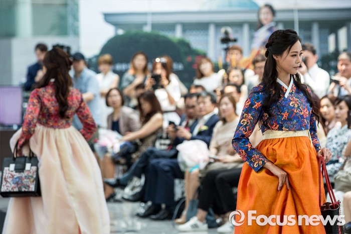 (서울=포커스뉴스) 17일 오후 서울 여의도 국회의원회관에서 열린 '2016 대한민국 국회 초청패션쇼-품'에서 모델들이 개량한복을 입고 멋진 워킹을 선보이고 있다.