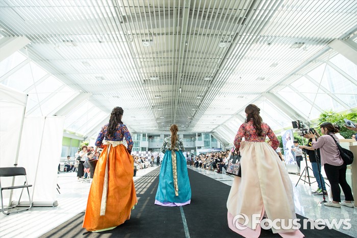 (서울=포커스뉴스) 17일 오후 서울 여의도 국회의원회관에서 열린 '2016 대한민국 국회 초청패션쇼-품'에서 모델들이 개량한복을 입고 멋진 워킹을 선보이고 있다.
