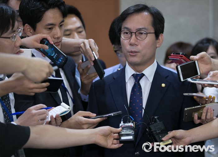 (서울=포커스뉴스) 김영우 새누리당 혁신비대위원이 17일 오전 서울 여의도 국회 정론관에서 전날 비대위 회의에서 논의된 탈당파 의원 일괄복당 결정과 관련 브리핑을 마친 뒤 취재진 질문에 답하고 있다.