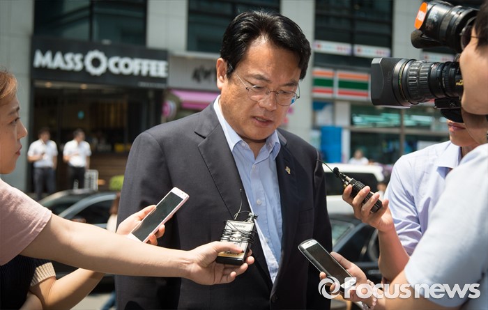 | △ 무소속 복당 문제로 취재진 질문 받는 정진석 |
