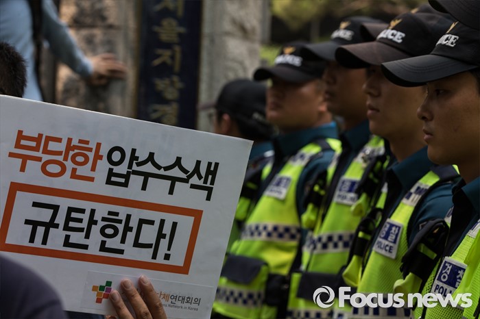 (서울=포커스뉴스) 17일 오후 서울 종로구 서울지방경찰청 앞에서 총선네트워크(총선넷) 회원들이 경찰 과잉수사 및 압수수색 규탄 기자회견을 하고 있다.