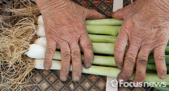 (청주=포커스뉴스) 최고기온이 30도가 넘으며 무더운 날씨를 보인 17일 오후 충북 청주시 흥덕구 들녘에서 농민들이 파를 수확하고 있다.