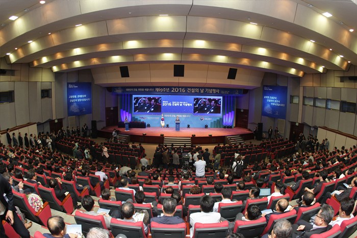 (서울=포커스뉴스) 강호인 국토교통부장관이 17일 건설의 날을 맞아 서울 강남구 건설회관에서 열린 2016 건설의 날 기념식에 참석해 축사를 하고 있다. <사진제공=국토교통부>