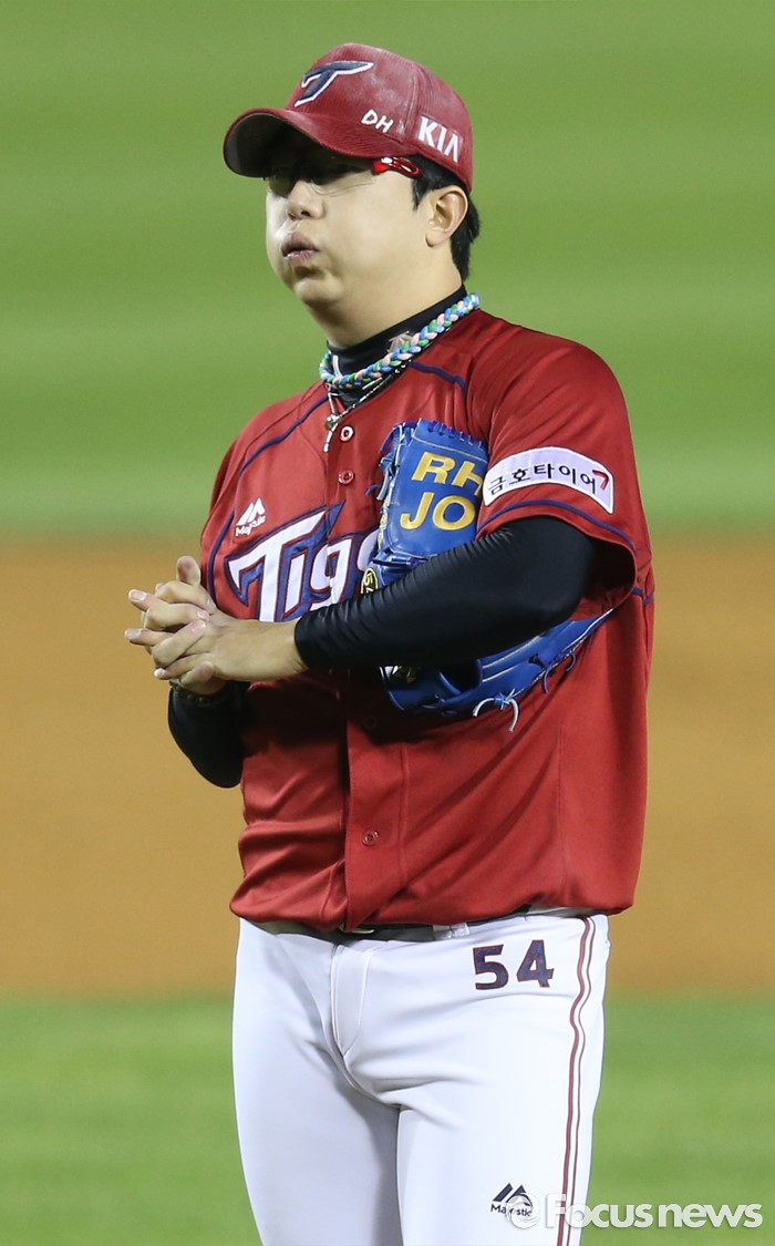 (서울=포커스뉴스) 17일 서울 잠실구장에서 열린 2016 프로야구 KIA-LG 경기에서 KIA 투수 양현종이 7회말 LG 손주인을 볼넷으로 진루시키고 교체를 기다리며 볼풍선을 불고 있다.