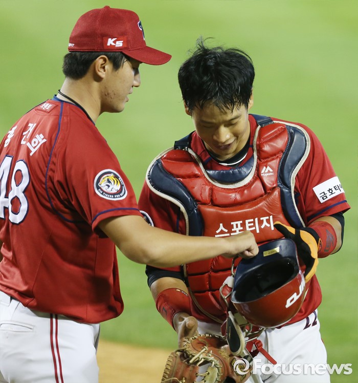 (서울=포커스뉴스) 17일 서울 잠실구장에서 열린 2016 프로야구 KIA-LG 경기에서 9회말 2사 3루에서 구원등판해 승리를 지킨 KIA 투수 헝건희가 포수 백용환의 마스크와 헬맷을 주워주고 있다.
