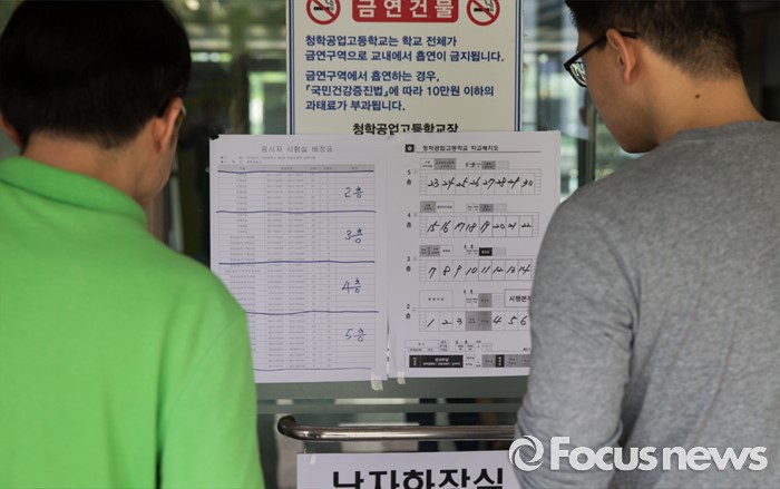 (인천=포커스뉴스) 2016년 제2회 지방공무원 임용 필기시험이 실시된 18일 오전 인천 연수구 청학공업고등학교에서 수험생들이 시험실을 확인하고 있다.