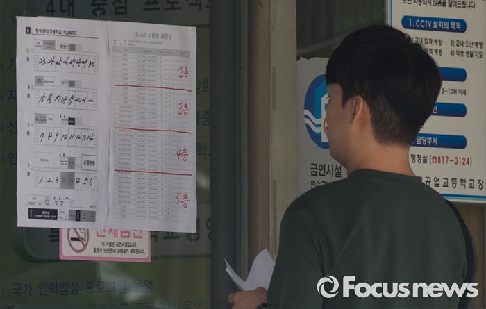 (인천=포커스뉴스) 2016년 제2회 지방공무원 임용 필기시험이 실시된 18일 오전 인천 연수구 청학공업고등학교에서 한 수험생이 시험실을 확인하고 있다.