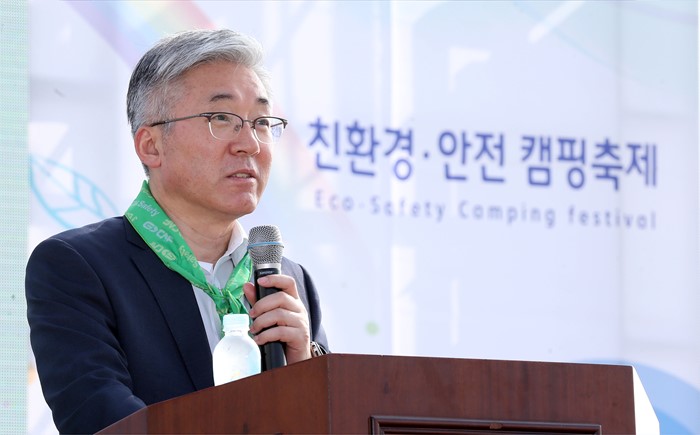 (고양=포커스뉴스) 김종덕 문화체육관광부 장관이 18일 경기도 고양시 킨텍스에서 열리고 있는 ‘친환경·안전 캠핑축제’를 찾아 환영사를 하고 있다. <사진제공=문화체육관광부>