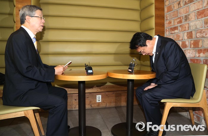 (서울=포커스뉴스) 정진석(오른쪽) 새누리당 원내대표가 19일 오전 서울 강남구 논현동 한 커피숍에서 김희옥 새누리당 혁신비상대책위원회 위원장에게 지난 16일 유승민 의원 등 복당 표결 과정에서의 발언에 대해 사과 하고 있다.