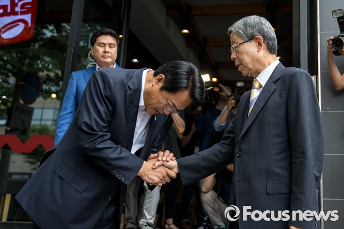 (서울=포커스뉴스) 김희옥(오른쪽) 새누리당 혁신비상대책위원장과 정진석 원내대표가 19일 오전 서울 강남구 논현동 한 커피숍에서 회동을 마친 뒤 악수 하고 있다.