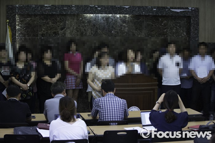 (안산=포커스뉴스) 19일 오전 경기도 안산시 안산교육지원청에서 단원고 재학생 학부모들의 세월호 희생자 존치교실 대안을 촉구하는 기자회견이 열리고 있다. 사진은 재학생 학부모들의 요구로 모자이크 처리 되었다.