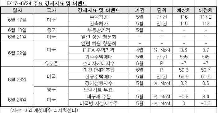 이번주 주목할 이벤트와 경제지표는 △미국 5월 기존주택판매 발표 △영국 브렉시트(영국의 유럽연합 탈퇴) 투표 결과 △미국 6월 마킷 제조업 구매관리자지수(PMI) 발표 등이 있다.