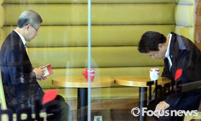 (서울=포커스뉴스) 김희옥 새누리당 혁신비상대책위원장과 정진석 원내대표가 19일 오전 서울 강남구 논현동 한 카페에서 비상대책위원회 정상화를 위한 회동을 하고 있다. 이번 회동은 지난 16일 탈당 무소속 의원들의 일괄복당을 결정한 혁신비대위 회의 과정에 불만을 제기하고 김 위원장이 칩거에 들어간지 나흘째 전격적으로 이뤄진 회동이다.