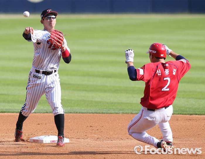 (서울=포커스뉴스) 19일 서울 잠실구장에서 열린 2016 프로야구 KIA-LG 경기 1회초 1사 1루에서 LG 2루수 손주인이 KIA 김주찬의 유격수앞 땅볼때 1루주자 신종길을 2루에서 포스아웃시키고 1루로 송구하며 병살을 시도하고 있다.