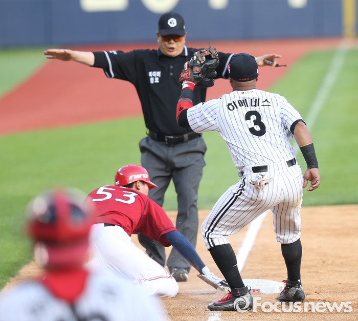 (서울=포커스뉴스) 19일 서울 잠실구장에서 열린 2016 프로야구 KIA-LG 경기 6회초 2사후 1,3루에서 KIA 1루주자 김주찬이 2루 도루하는 사이 3루주자 김호령이 포수 견제구에 귀루하며 세이프되고 있다.