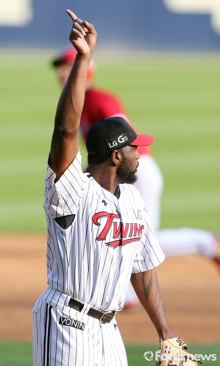(서울=포커스뉴스) 19일 서울 잠실구장에서 열린 2016 프로야구 KIA-LG 경기L3회초 2사 1,2루에서 LG 투수 소사가 KIA 서동욱의 유격수 플라이볼 타구를 가리키고 있다.