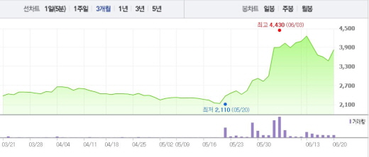 일신바이오의 주가는 5월 후반부터 가파르게 상승했다. 1달 전 주가인 5월20일(2365원)과 비교했을 때 61.3% 상승한 수치다.