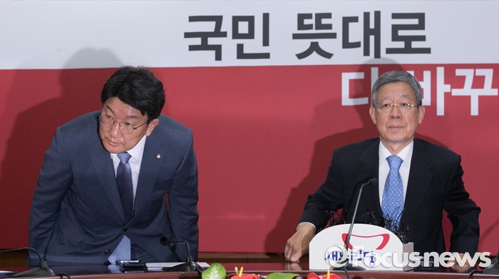 (서울=포커스뉴스) 20일 오전 서울 여의도 새누리당사에서 열린 혁신비상대책위원회의에 참석한 김희옥(오른쪽) 혁신비대위원장과 권성동 사무총장이 자리에 앉고 있다.