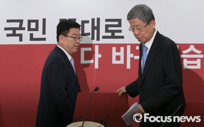 (서울=포커스뉴스) 20일 오전 서울 여의도 새누리당사에서 열린 혁신비상대책위원회의에 참석한 김희옥(오른쪽) 혁신비대위원장과 김광림 정책위의장이 자리에 앉고 있다.