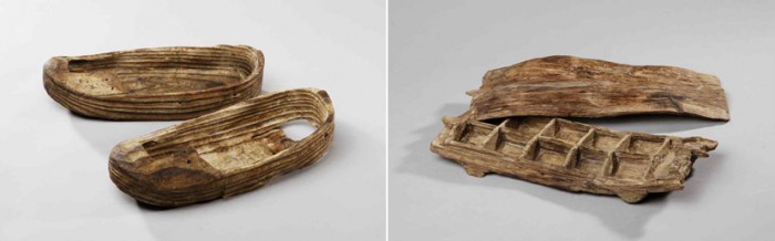 ☞목간(木簡): 반듯하게 다듬은 나무 면에 먹으로 문자를 기록한 목조각특별기획전 '목기, 생활의 지혜'가 5월24일부터 7월17일까지 부산 동래구 복천박물관에서 열리고 있다. 사진은 특별전에 전시 중인 '부여 쌍북리 유적 출토 나막신'(왼쪽)과 '창녕 송현동 고분 출토 사각용기와 뚜껑'이다.<사진제공=문화재청>