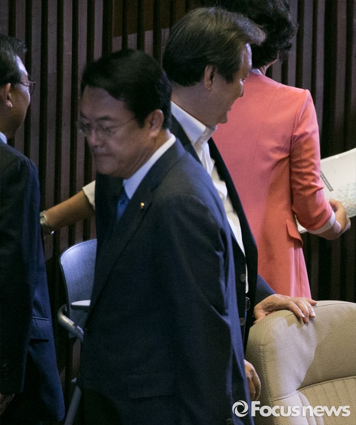 (서울=포커스뉴스) 20일 오전 서울 여의도 국회에서 열린 343회 국회(임시회) 3차 본회의에 참석한 김무성(오른쪽) 새누리당 전 대표와 정진석 원내대표가 인사한 뒤 자리로 향하고 있다.