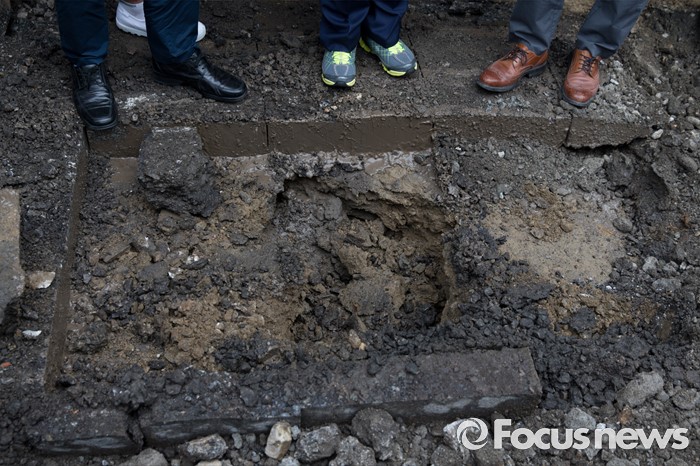 (서울=포커스뉴스) 박원순 서울시장이 20일 오전 서울역 인근 도로에서 동공 굴착 원인조사 및 복구과정을 점검하고 있다.