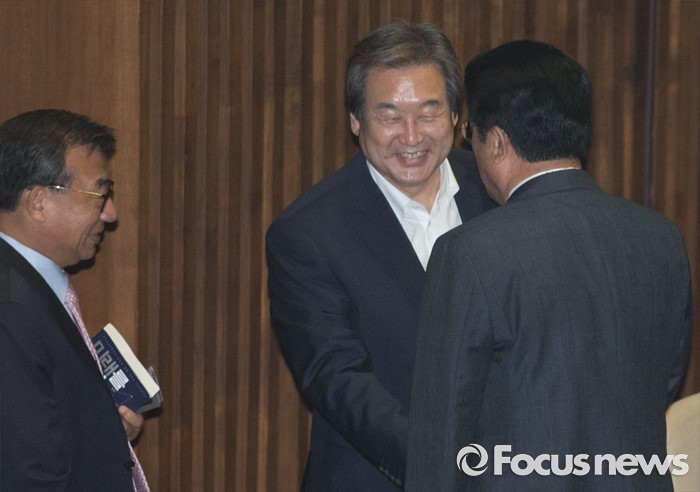 (서울=포커스뉴스) 20일 오전 서울 여의도 국회에서 열린 343회 국회(임시회) 3차 본회의에 참석한 김무성(가운데) 새누리당 전 대표와 정진석(오른쪽) 원내대표가 인사하고 있다. 왼쪽은 이정현 의원.
