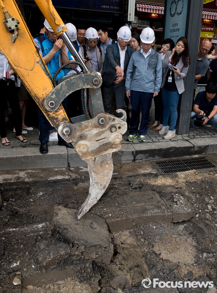 (서울=포커스뉴스) 박원순 서울시장이 20일 오전 서울역 인근 도로에서 동공 굴착 원인조사 및 복구과정을 점검하고 있다.