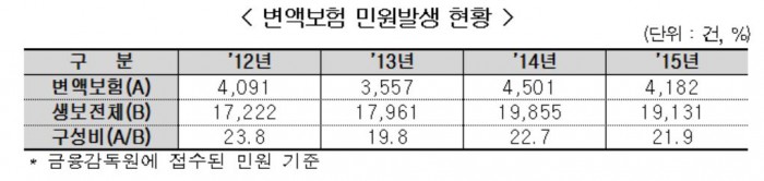 실제 금감원에 접수된 민원 건수를 살펴보면 2015년 생보사 전체 민원 1만9131건 중 변액보험 관련 민원은 4182건으로 21.9%를 차지했다.