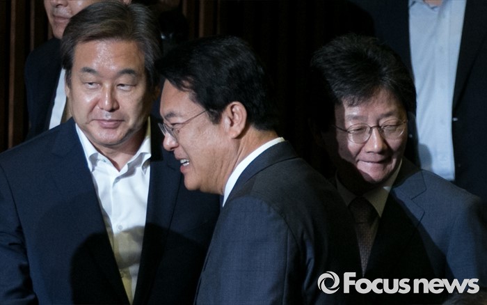 (서울=포커스뉴스) 20일 오전 서울 여의도 국회에서 열린 343회 국회(임시회) 3차 본회의에 참석한 정진석 새누리당 원내대표가 교섭단체 대표연설을 마친 뒤 김무성 전 대표, 유승민 의원 등과 악수하고 있다.