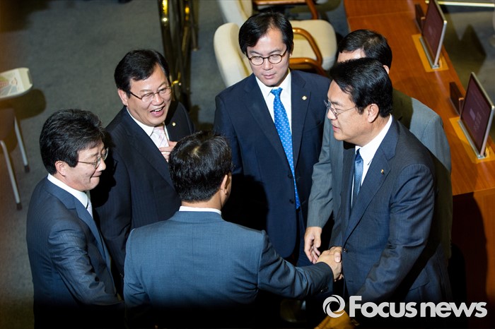 (서울=포커스뉴스) 정진석(오른쪽) 새누리당 원내대표와 권성동(오른쪽 두 번째) 새누리당 사무총장이 20일 오전 서울 여의도 국회에서 열린 본회의에 참석해 인사 하고 있다.