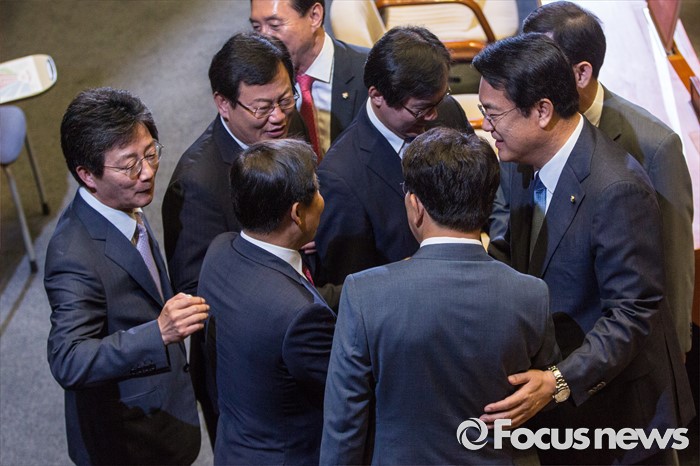 (서울=포커스뉴스) 정진석(오른쪽) 새누리당 원내대표와 권성동(오른쪽 두 번째) 새누리당 사무총장이 20일 오전 서울 여의도 국회에서 열린 본회의에 참석해 인사 하고 있다.