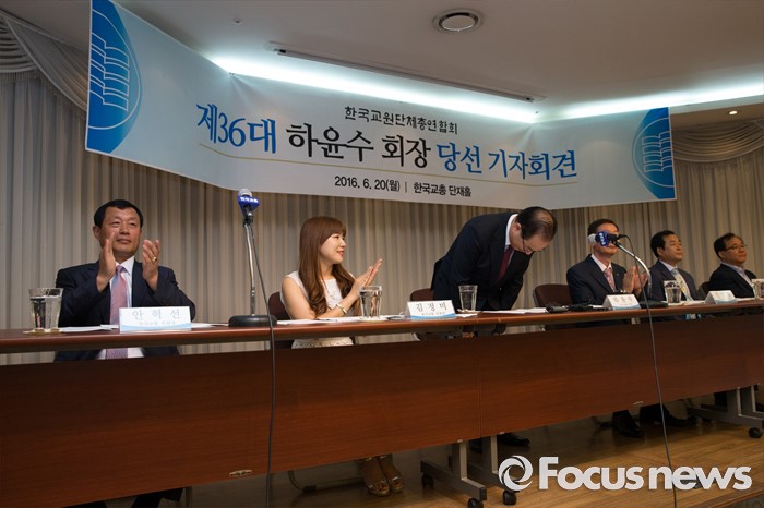 (서울=포커스뉴스) 20일 오전 서울 서초구 한국교원단체총연합회에서 열린 제36대 한국교총 회장선거에 선출된 하윤수 부산교대 총장이 기자회견 전 인사를 하고 있다.