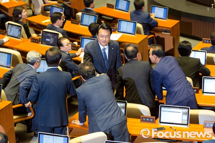 (서울=포커스뉴스) 정진석 새누리당 원내대표가 20일 오전 서울 여의도 국회에서 열린 본회의에 참석해 교섭단체 대표 연설을 마친 뒤 동료 의원들과 악수 하고 있다.