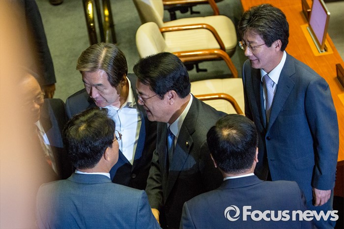 (서울=포커스뉴스) 정진석 새누리당 원내대표가 20일 오전 서울 여의도 국회에서 열린 본회의에 참석해 교섭단체 대표 연설을 마친 뒤 동료 의원들과 본회의장을 나서고 있다. 왼쪽부터 권성동 새누리당 사무총장, 김무성 전 새누리당 대표, 정진석 원내대표, 유승민 새누리당 의원.