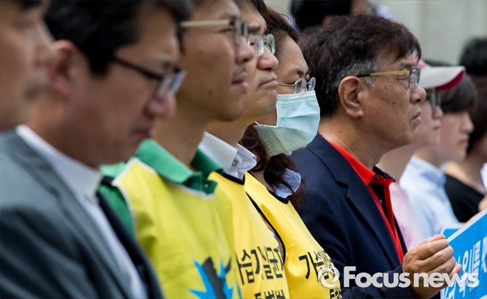 (서울=포커스뉴스) 20일 오후 서울 종로구 세종문화회관 앞 계단에서 환경운동연합과 시민사회단체들이 가습기 살균제 참사 전국네트워크 출범 기자회견을 하고 있다.