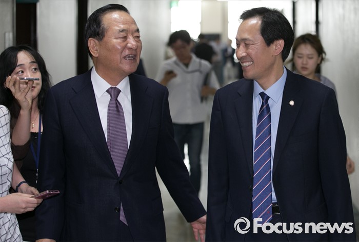 (서울=포커스뉴스) 20일 오후 서울 여의도 국회에서 열린 정보위원회 전체회의에 참석한 서청원(왼쪽) 새누리당 전 최고위원과 우상호 더불어민주당 원내대표가 회의장을 나와 대화하며 이동하고 있다.