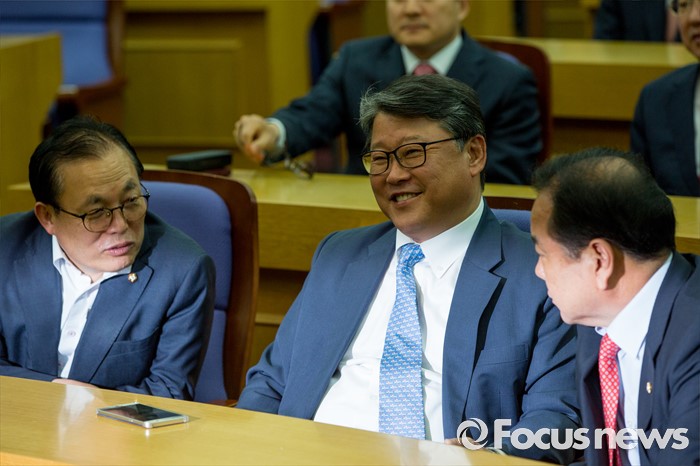| △ 대화 나누는 조원진-이우현-이채익 의원 |