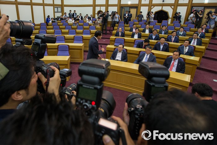 (서울=포커스뉴스) 조원진(오른쪽 두 번째) 새누리당 의원을 비롯한 친박계 초재선 의원들이 20일 오후 서울 여의도 국회의원회관에 모여 간담회 시작을 기다리고 있다.