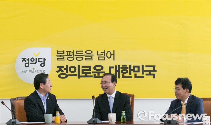 (서울=포커스뉴스) 노회찬(가운데) 정의당 원내대표가 20일 오후 서울 여의도 국회를 방문한 유정복(왼쪽) 인천시장과 서해5도 지원 특별법 등과 관련 면담을 하고 있다. 오른쪽은 김종대 의원.