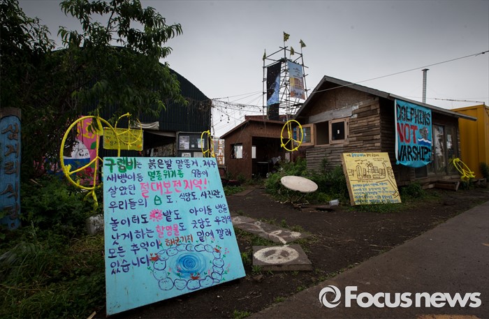 (제주=포커스뉴스) 서귀포시가 제주해군기지 크루즈터미널 조성공사를 이유로 해군기지 건설 반대운동에 사용해 온 망루 등 시설물들을 자진 철거하라는 3차 계고장을 강정마을회에 보내 행정대집행이 예고되고 있다. 20일 오전 제주 서귀포시 강정마을 중덕삼거리에 크루즈터미널 우회도로 공사 부지에 포함된 시설물들이 자리하고 있다. 이날 행정대집행 문제로 회의를 한 강정마을회는 "이들 시설물은 기지 건설 반대 투쟁에 대한 상징적인 것으로 함부로 철거할 수 없다고 마을 주민의 의견을 모았다"며 시설물을 이전한 뒤 보존해달라'고 제주도에 건의했다.