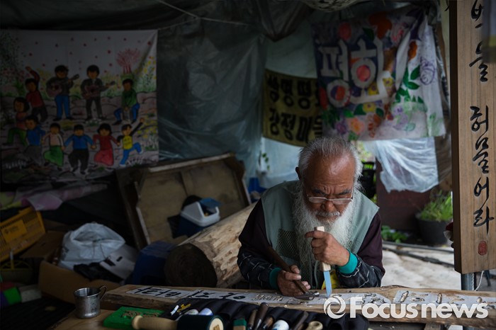 (제주=포커스뉴스) 서귀포시가 제주해군기지 크루즈터미널 조성공사를 이유로 해군기지 건설 반대운동에 사용해 온 망루 등 시설물들을 자진 철거하라는 3차 계고장을 강정마을회에 보내 행정대집행이 예고되고 있다. 20일 오전 제주 서귀포시 강정마을에서 문정현 신부가 생명과 평화에 관한 글을 전각하고 있다. 이날 행정대집행 문제로 회의를 한 강정마을회는 "이들 시설물은 기지 건설 반대 투쟁에 대한 상징적인 것으로 함부로 철거할 수 없다고 마을 주민의 의견을 모았다"며 시설물을 이전한 뒤 보존해달라'고 제주도에 건의했다.