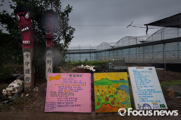 (제주=포커스뉴스) 서귀포시가 제주해군기지 크루즈터미널 조성공사를 이유로 해군기지 건설 반대운동에 사용해 온 망루 등 시설물들을 자진 철거하라는 3차 계고장을 강정마을회에 보내 행정대집행이 예고되고 있다. 20일 오전 제주 서귀포시 강정마을 중덕 삼거리에 제주해군기지 건설을 반대하는 예술가가 만든 장승과 메시지들이 세워져 있다. 이날 행정대집행 문제로 회의를 한 강정마을회는 "이들 시설물은 기지 건설 반대 투쟁에 대한 상징적인 것으로 함부로 철거할 수 없다고 마을 주민의 의견을 모았다"며 시설물을 이전한 뒤 보존해달라'고 제주도에 건의했다.