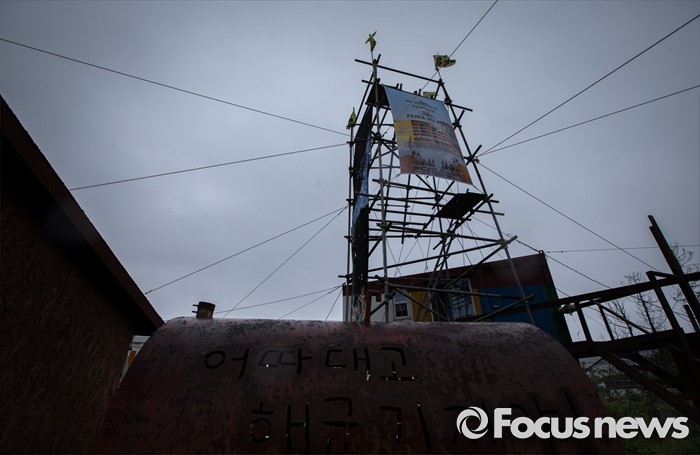 (제주=포커스뉴스) 서귀포시가 제주해군기지 크루즈터미널 조성공사를 이유로 해군기지 건설 반대운동에 사용해 온 망루 등 시설물들을 자진 철거하라는 3차 계고장을 강정마을회에 보내 행정대집행이 예고되고 있다. 20일 오전 제주 서귀포시 중덕삼거리에 크루즈터미널 우회도로 공사 부지에 포함된 해군기지 반대 상징물 '망루'가 자리를 지키고 있다. 이날 행정대집행 문제로 회의를 한 강정마을회는 "이들 시설물은 기지 건설 반대 투쟁에 대한 상징적인 것으로 함부로 철거할 수 없다고 마을 주민의 의견을 모았다"며 시설물을 이전한 뒤 보존해달라'고 제주도에 건의했다.