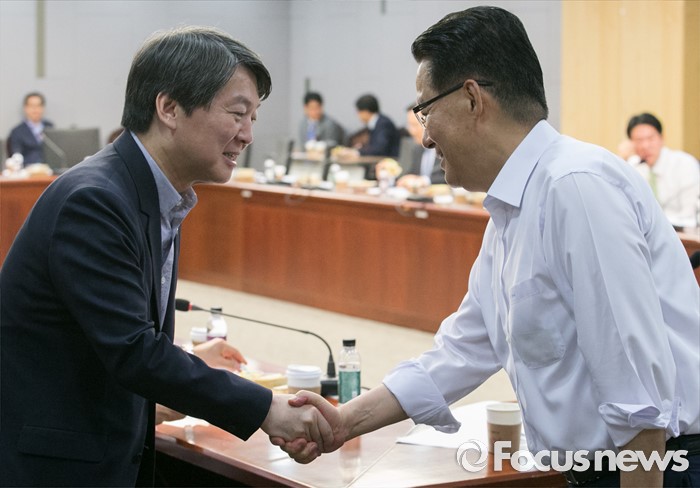 (서울=포커스뉴스) 21일 오전 서울 여의도 국회 의원회관에서 열린 국민의당 17차 정책역량강화 워크숍에 참석한 안철수(왼쪽) 상임공동대표와 박지원 원내대표가 인사하고 있다.