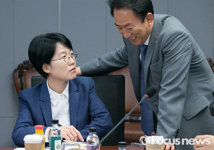 (서울=포커스뉴스) 21일 오전 서울 여의도 국회 의원회관에서 열린 국민의당 17차 정책역량강화 워크숍에 참석한 박선숙(왼쪽) 의원과 김명진 원내대표비서실장이 대화하고 있다.