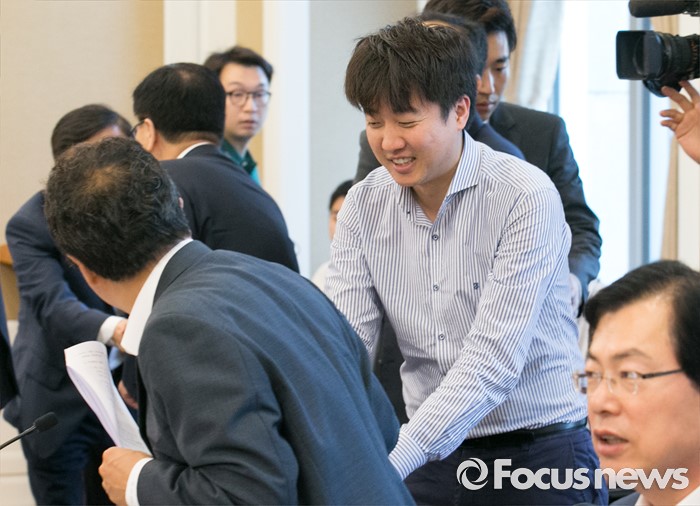 (서울=포커스뉴스) 21일 오전 서울 여의도 국회 귀빈식당에서 열린 새누리당 일자리특위 1차 회의에 참석한 이준석 클라세스튜디오 대표가 의원 및 참석자들과 인사하고 있다.