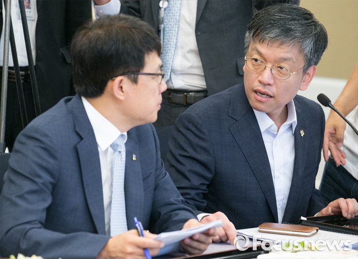 (서울=포커스뉴스) 21일 오전 서울 여의도 국회 귀빈식당에서 열린 새누리당 일자리특위 1차 회의에 참석한 최상목(오른쪽) 기획재정부 1차관과 고영선 고용노동부 차관이 대화하고 있다.