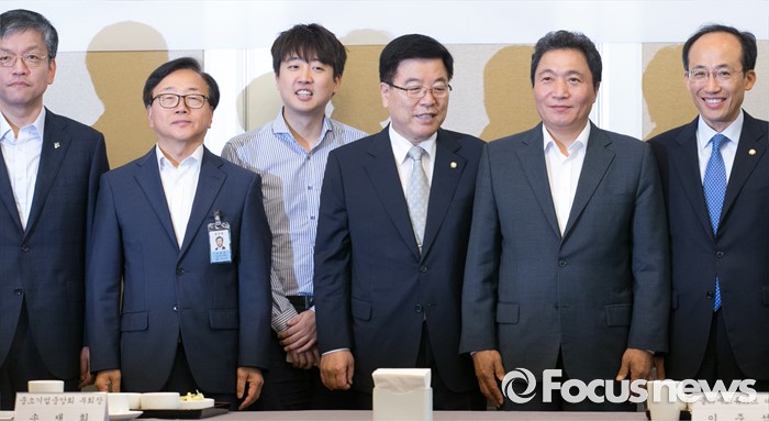 (서울=포커스뉴스) 21일 오전 서울 여의도 국회 귀빈식당에서 열린 새누리당 일자리특위 1차 회의에 참석한 최상목(왼쪽부터) 기획재정부 1차관, 이동근 대한상의 부회장, 이준석 클라세스튜디오 대표, 김광림 정책위의장, 이학재 위원장, 추경호 의원이 기념촬영을 하고 있다.